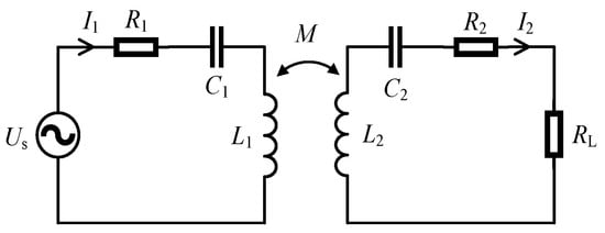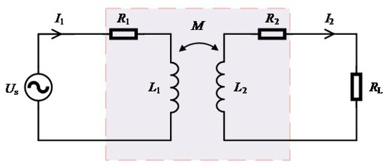 The mutual inductance circuit model of the coupling coil is shown in Figure 3. US is the AC power supply at the transmitting coil, I1 and I2 are the currents of the transmitting and receiving circuits, L1 and L2 are the self-inductances of the transmitting and receiving coils, and R1 and R2 are the coil resistances of the transmitting and receiving coils, respectively. Mutual inductance M is used to represent the degree of coupling between the two coils [22].