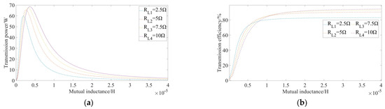 Relationship between coil mutual inductance and transmission power and efficiency under different load resistances: (a) coil transmission power; (b) coil transmission efficiency.