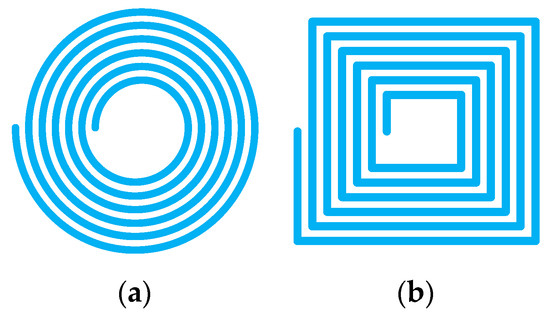 Flat coils with different shapes: (a) circular plane spiral coil; (b) square plane spiral coil.
