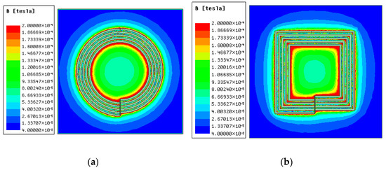Magnetic field nephogram of plane coils with different shapes: (a) circular plane spiral coil; (b) square plane spiral coil.