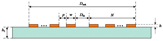 The cross-section of the circular coil designed through PCB is shown in Figure 9. N is the number of coil turns, Dout is the outer diameter of the coil, Din is the inner diameter of the coil, P is the coil turn spacing, w is the coil wire width, h is the thickness of the copper wire laid on the PCB, and h1 is the thickness of the PCB.