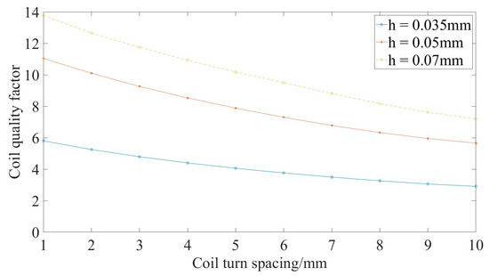 There are generally three copper thicknesses used for PCB flat coils: 0.035 mm, 0.05 mm, and 0.07 mm. The outer diameter of the fixed coil is set as 9 cm, the coil line width is set as 2 mm, the coil turns are set as 7, and the frequency is set as 100 kHz. The self-inductance and resistance values of the coil obtained by simulating different copper thicknesses are shown in Table 4, Table 5 and Table 6. The simulation data of the quality factor of the coil with different thicknesses are shown in Figure 11.