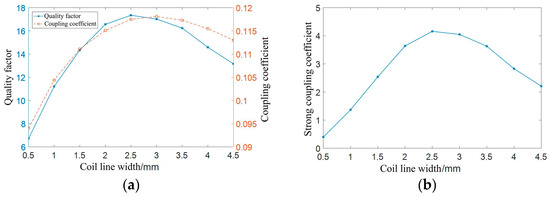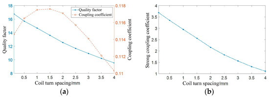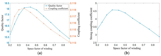 Q1Q2k2 is defined as the strong coupling coefficient [29] of the coil. Equation (36) reveals that the larger the strong coupling coefficient is, the higher the transmission efficiency of the coil. Previous analysis has shown that the design of the coil must consider the degree of coupling between the coils in addition to its quality factor. The quality factor and the coupling coefficient of the coil correlate with the strong coupling coefficient. Therefore, maximizing the strong coupling coefficient has become a research goal.