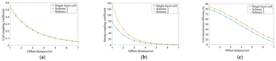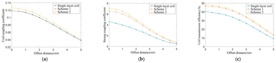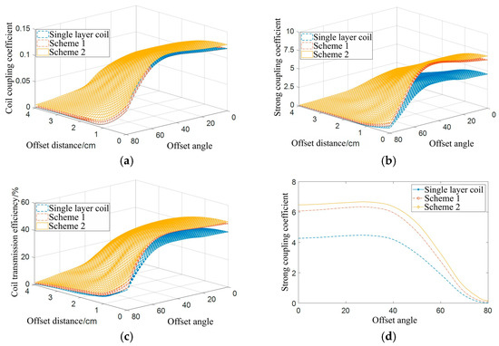 The proposed double-layer coil structure is validated to address the impact of coil offset on transmission efficiency. Table 12 provides the simulation and experimental coil parameters for the single-layer coils and Schemes 1 and 2 double-layer coils.