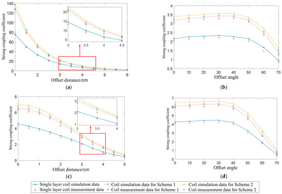 Simulation data and measurement calculation data of the strong coupling coefficient for coil offset: (a) coaxial parallel offset; (b) coaxial nonparallel offset; (c) parallel offset of different axes; (d) different axes are not parallel offset.