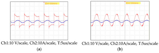 Oscilloscope-measured waveform: (a) voltage (red) and current (blue) waveforms at the transmitting end; (b) load voltage (red) and current (blue) waveform at the receiving end.