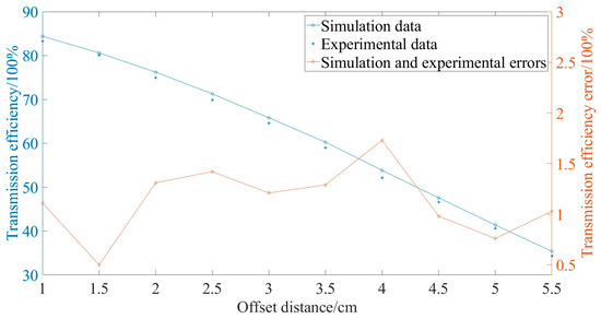 During measurement, there may be errors between the experimental values and the software simulation values due to the equipment and the environment. The standard deviation can be used to verify whether the experimental results match the simulation data. The transmission efficiency errors between the experimental and simulation results at different offset distances are shown in Figure 34, and it is shown that the results were acceptable.