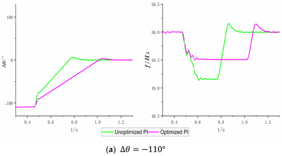 To demonstrate the effectiveness of the frequency constraint in Equation (7) and the optimization achieved by the GJO algorithm, the frequency nadir corresponding to a phase difference of −60° is taken as the lower limit under the constraint with the untuned conventional PI parameter with a value of 49.56 utilized, and all the other simulation conditions remain unchanged after optimization through the GJO algorithm; the corresponding frequency adjustment curve is depicted by the blue line in Figure 11d. It is evident that the untuned value is underestimated, similar to the curve associated with the conventional PI parameters. However, after optimizing the PI parameters, the phase difference adjustment occurs more rapidly. Therefore, this validates the effectiveness of the frequency constraint range specified in Equation (7), and at the same time the optimized PI parameters ensure their optimality.