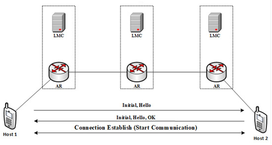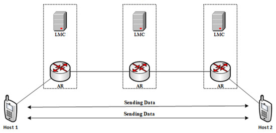 Figure 1 depicts the MOFI architecture model, which consists of two hosts—the Host 1 and the Host 2—and an AR. In this model, the mapping system is distributed, with each AR performing the mapping control operation using a local mapping controller (LMC) and a hash table. End-to-end communication between two hosts is performed with host ID, and location identifiers (LOCs) are used for data delivery in the network. To provide an optimal path, the LOC query operation is performed first to determine the LOC of the mobile host (MH) before data transmission. Each AR has an HID-LOC register (HLR) for mapping control. When the client wants to initiate communication with the server, it first looks up the RLOC of the destination host using its HID. This lookup is performed using the mapping control components of the MOFI protocol, which is responsible for managing and distributing the mapping information. Once the RLOC of the destination server is known, the client can use it to send packets to the destination. The packets are then forwarded by the routers in the network based on their RLOCs until they reach the destination server.