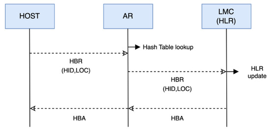 When a host enters a network, a HID-LOC binding operation is performed to register the HID and LOC of the host in the mapping system. This is achieved by exchanging HBR and HBA messages, as shown in Figure 2. When a new host is attached to the network, the first HBR message is exchanged with AR. Then, the AR checks whether the HID and LOC of the host are present in the hash table. Since there will be no such addresses for the new host, AR forwards the HBR message to HLR. HLR then updates its register by saving the HID and LOC of the host and sends an HBA message to AR, which in turn forwards it to the host. After this binding operation, the HID and LOC of the host are registered in the hash table.
