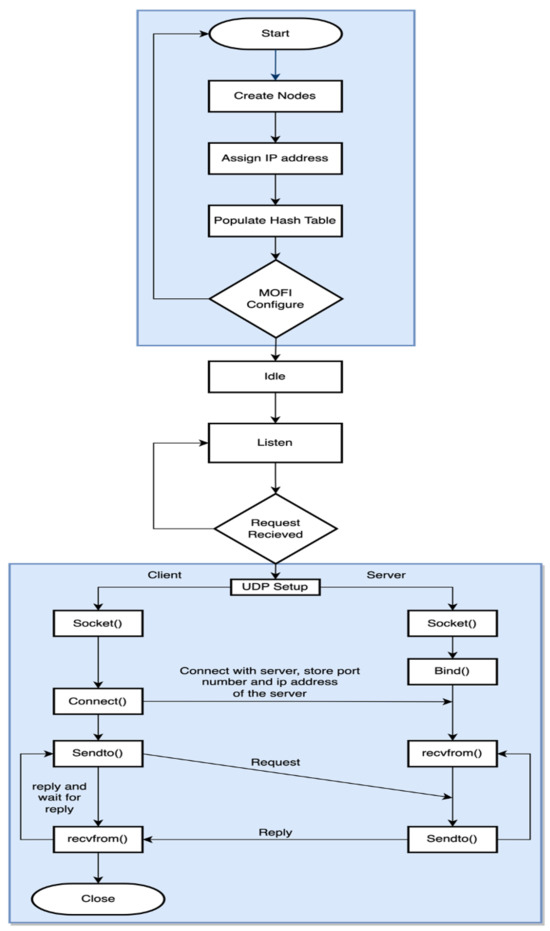To initiate the UDP client, it first creates the UDP socket and then sends a message to the server. The UDP client and server socket are created, and the client sends a message to the server, where the server waits until the datagram arrives from the client. The datagram is then processed by the server, which replies to the client and goes back to waiting until the datagram arrives from the client. The client processes the reply given by the server and, if required, sends a message again to the server. This process continues until they exchange messages with each other. After completing the communication between the client and server, the socket will be closed, and the program will exit. The flowchart for the UDP-based MOFI is shown in Figure 3.