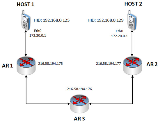 In this section, we describe the experiments we conducted to evaluate the performance of the QUIC protocol in a MOFI network using Golang for simulation. Golang has become a popular programming language for implementing QUIC. Golang was created by Google and is renowned for its efficiency, concurrency support, and simplicity, making it an excellent option for creating network applications. In order to implement QUIC, Golang also offers a standard library that has functions for establishing QUIC connections, transmitting and receiving packets, and handling failures. The development and testing of QUIC-based apps take less time and effort thanks to this library, which also makes QUIC implementation simpler. The experimental setup used to conduct the testing is illustrated in Figure 7. In this setup, two hosts (Host 1 and Host 2) and three ARs with LMCs (AR 1, AR 2, and AR 3) were employed. Host 1 acted as the sender, while Host 2 played the role of the receiver. Host 1 used the HID of 192.168.0.125, and Host 2 used the HID of 192.168.0.129. For the LOC, a private IPv4 address (172.20.0.1) was used as the A-LOC, while a public IPv4 address (216.58.194.x) was used as the B-LOC. Our goal was to measure the latency, delay, packet loss, and throughput of the Q-MOFI and compare it with the other existing model, MOFI, which uses UDP.