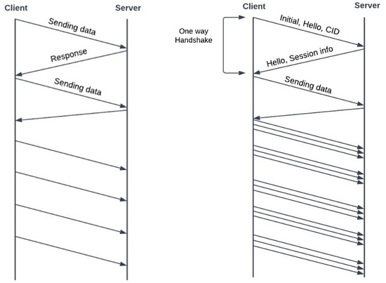 Figure 8 illustrates the handshake mechanism used by UDP and QUIC. UDP is connectionless, allowing fast and lightweight data transfer without an explicit handshake. QUIC, on the other hand, emphasizes reliability and security through a robust handshake procedure, ensuring secure and efficient data exchange. Both methods demonstrate the importance of careful handshakes in data transfer. One of the main features of QUIC is its ability to establish a secure, reliable connection with low latency, even in poor network conditions. The handshake process is similar to the handshake used by TLS (Transport Layer Security), which is the protocol used to secure many web applications. The handshake process in QUIC involves a series of messages exchanged between the client and server endpoints. The client initiates the handshake by sending a “ClientHello” message to the server, which includes information about the client’s preferred cryptographic algorithms, the server’s hostname, and other parameters. The server responds with a “ServerHello” message, which includes its own preferred cryptographic algorithms and other parameters. The server also sends a digital certificate that the client can use to verify the server’s identity and establish a secure connection. Once the handshake is complete, the client and server can begin sending data to each other over the QUIC connection. Because QUIC uses UDP as its underlying transport protocol, it does not suffer from the same latency issues as TCP, and it can establish connections more quickly and with less overhead.