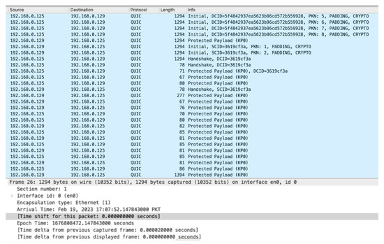Figure 10 shows the Wireshark result using the QUIC protocol. The result provides valuable information for analyzing the network communication between the client and server. In addition to the source and destination IP addresses and ports, the result contains the size of the packet and the checksum, which are important for verifying the integrity and reliability of the data transmission. Moreover, Wireshark offers a thorough view of each datagram that contains details on the header and data fields. The QUIC protocol uses different types of frames to carry various data payloads, including handshake messages, encrypted data, and control messages. Analyzing these frames can provide insights into the performance and behavior of the QUIC protocol, such as the number of packets exchanged during the connection establishment, the size and type of the data payloads, and the latency of the transmission. By using Wireshark to examine the QUIC frames, you can identify any issues or anomalies that may affect the network communication and optimize the performance of the network.