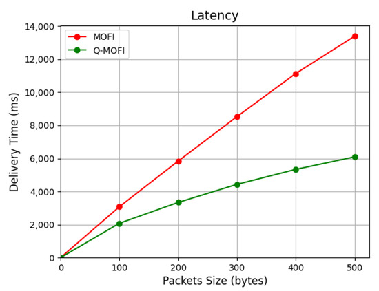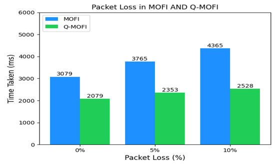 Figure 14 shows the delivery time or latency for MOFI and Q-MOFI with varying packet loss percentages in a network for a message transmission from one host to another. It shows that as the packet loss percentage increases, the latency for both protocols also increases. If there is a packet loss of 5% or 10%, the latency increases for both MOFI and Q-MOFI because the lost packets will need to be re-transmitted, which will increase the overall time it takes for the data to be transmitted. However, the increase in latency is more significant for MOFI compared to Q-MOFI when there is packet loss.