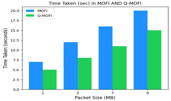 Figure 15 illustrates the time taken by MOFI and Q-MOFI for data transfer measured in megabits per second (Mbs). The tests were conducted ranging from 1 Mbs to 9 Mbs. The results indicate that Q-MOFI requires less time compared to MOFI. As the data volume increases, MOFI takes more time, whereas Q-MOFI continues to perform well. Multiplexing in Q-MOFI allows for multiple data streams to be sent over a single connection, leading to better utilization of the underlying network resources and potentially faster data transfer. Q-MOFI’s multiplexing divides data into multiple independent streams, each assigned its own stream identifier. These streams are interleaved and transmitted within a single packet, capable of carrying multiple data streams simultaneously. In contrast to MOFI, which transfers only one data stream at a time over a single connection, Q-MOFI offers a significant performance improvement.