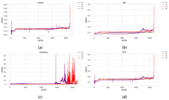 Statistical features of the vibration signals. (a) Mean of vibration signals of four ball bearings over multiple cycles; (b) Standard deviation of vibration signals of four ball bearings over multiple cycles; (c) Kurtosis of vibration signals of four ball bearings over multiple cycles; (d) Root mean square of vibration signals of four ball bearings over multiple cycles.