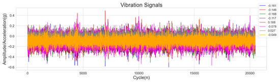 The crucial step of this section provides understanding and insights into the dataset to uncover patterns, inconsistencies, trends, and relationships within the vibration data as discussed in Section 3. In Figure 3, four test files are presented. The patterns show how the vibration varies over time as the bearings go through their cycles. The vibration intensity is measured in “g” units and ranges from −0.8 to 0.8. The cycles, numerically identified from 0 to 20,480, represent the operational phases of the ball bearings. Within the vibration data, traceable spikes emerge. Between cycles 3000 and 8000, there are noticeable spikes indicating moments when vibration suddenly increased quite a bit and then rises significantly. These occurrences likely indicate sudden changes in operating conditions or as a result of external factors impacting its performance. Between cycles 11,000 and 16,000, there is a recurring pattern of spikes in the vibration amplitude. This anomaly shows a consistent occurrence in the vibration behaviour of the ball bearings during this cycle range.