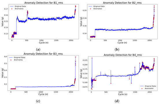Root mean square anomaly detection for four ball bearings. (a) Root mean square anomaly detection of ball bearing 1; (b) Root mean square anomaly detection of ball bearing 2; (c) Root mean square anomaly detection of ball bearing 3; (d) Root mean square anomaly detection of ball bearing 4.
