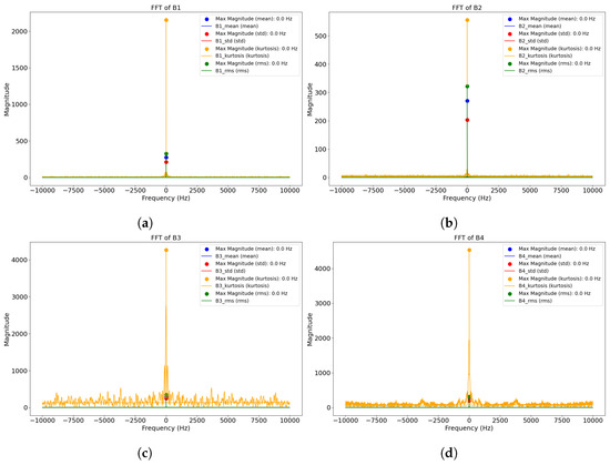FFT analysis of four ball bearings vibration signals. (a) FFT analysis of ball bearing 1 vibration signals; (b) FFT analysis of ball bearing 2 vibration signals; (c) FFT analysis of ball bearing 3 vibration signals; (d) FFT analysis of ball bearing 4 vibration signals.