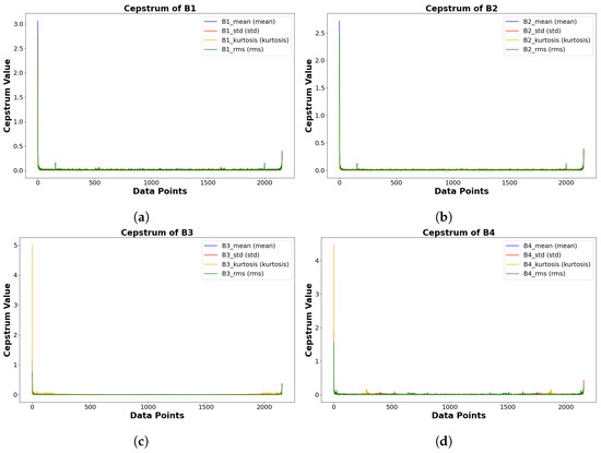 Cepstrum analysis of four ball bearings vibration signals. (a) Cepstrum analysis of ball bearing 1 vibration signals; (b) Cepstrum analysis of ball bearing 2 vibration signals; (c) Cepstrum analysis of ball bearing 3 vibration signals; (d) Cepstrum analysis of ball bearing 4 vibration signals.
