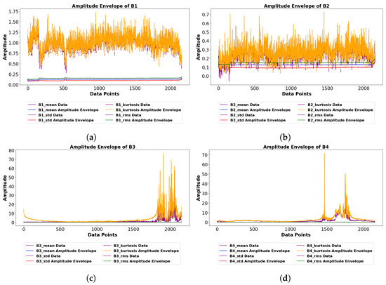 Amplitude envelope analysis of four ball bearings vibration signals. (a) Amplitude envelope analysis of ball bearing 1 vibration signals; (b) Amplitude envelope analysis of ball bearing 2 vibration signals; (c) Amplitude envelope analysis of ball bearing 3 vibration signals; (d) Amplitude envelope analysis of ball bearing 4 vibration signals.