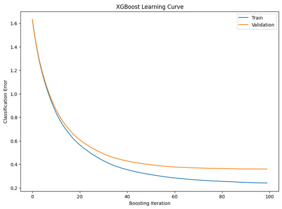 A new hyperparameter optimisation task was initiated to improve the performance of the model. This task consisted of 20 trials, with the first iteration giving the best improvement with a value of around 0.9661. The key hyperparameters tested involved a learning rate of 0.2469 and the use of 535 estimators. The model presented an overall improvement when compared to other models employed in this study. As shown in Table 4, the model achieved about 96.61% accuracy, which reveals the percentage of predictions made from all predictions. A harmonious balance between the accuracy of positive predictions and the fraction of positives that were captured was approximately 0.9710. The values 0.9810 and 0.9617 of precision and recall, respectively, show a high consistency of the model’s predictions. The average cross validation score on the training data is approximately 0.8516. The model learning curve is represented in Figure 8.