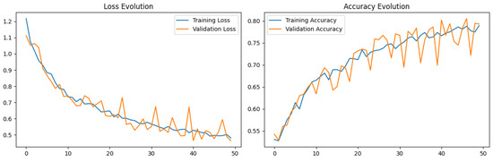 To improve the training process and model convergence, amplitude scaling was also employed to transform the input data. The boosted LSTM model correctly detected about 79.30% of the instances, as shown in Table 5. While a better value of 0.7748 F1 score was achieved over the non-boosted algorithm. This indicates a reasonable balance between the precision and recall. Precision numbers indicate that 86.83% of the instances detected as positives are true positives of the ball bearing health state. The model was able to identify about 73.87% of the true positive instances for each class. After 50 tested epochs, ‘unit’ and ‘dense_units’ values of 128 and 128 were found as the best choices, respectively. Activation was evaluated with ‘tanh’ and ‘softmax’, with ‘tanh’ being the better configuration. The Adaptive Moment Estimation (Adam) was employed to combine the Root Mean Square Propagation (RMSprop) and Momentum for a faster convergence and effectiveness of the model. The training and validation accuracy for this model is shown in Figure 9.