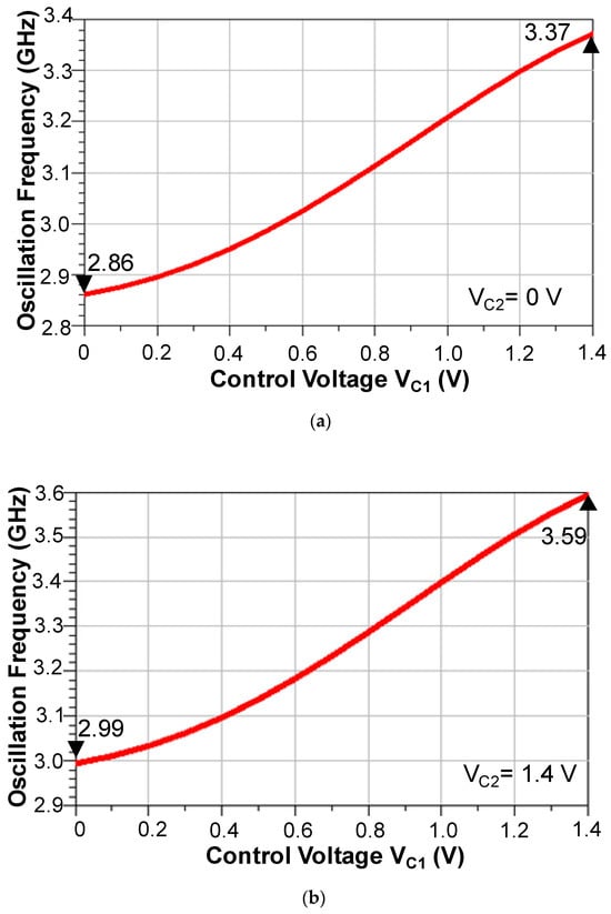 Simulated output tuning ranges of the proposed VCO by adjusting the control voltage VC1 from 0 to 1.4 V at (a) the control voltage VC2 of 0 V and (b) at the control voltage VC2 of 1.4 V.