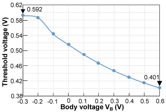 Simulated NMOS transistor threshold voltage versus the body voltage VB.
