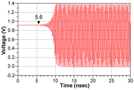 The voltage of 0.6 V is given to the gate terminal biases of the NMOS transistors M3 and M4 for this work. The control voltage VG of 0.6 V is greater than the controlled threshold voltage (Vt = 0.446 V) by using the forward source-to-body voltage at the body voltage VB of 0.3 V for the proposed CMOS VCO. The drain-to-source voltages of the NMOS transistors M3 and M4 are higher than the overdrive voltages (VOV = VGS − Vt) to satisfy the transistor saturation regions in the class-AB mode for the proposed CMOS VCO. Figure 5 shows the simulated start-up condition with the threshold voltage Vt of 0.446 V and drain terminal voltages of the PMOS and NMOS transistor cross-coupled pairs at the gate terminal bias of 0.446 V. The simulated operation situation is in the class-B mode of the VCO. The simulated start-up time is about 5.6 ns in the class-B mode of the VCO. Moreover, Figure 6 shows the simulated start-up condition with the threshold voltage Vt of 0.446 V and drain terminal voltages of the PMOS and NMOS transistor cross-coupled pairs at the gate terminal bias of 0.6 V. The simulated operation situation is at in class-AB mode of the VCO. The simulated start-up time is about 1 ns at the class-AB mode of the VCO. Obviously, the class-AB mode of the VCO has the robust start-up time of 1 ns to successfully run the oscillation mechanism. The proposed CMOS VCO adopts the class-AB mode to strengthen the start-up requirement and improve the quality factor of the LC tank. Furthermore, the proposed class-AB CMOS VCO has a better drain waveform to improve the phase noise and decrease the power dissipation due to the complementary PMOS and NMOS cross-coupled pairs. The proposed class-AB VCO also increases the tuning range by adopting analog coarse and fine tuning mechanisms. Based on the overall design concepts, the current-reused complementary technique formed by the PMOS and NMOS transistor cross-coupled pairs, the analog coarse and fine tuning mechanisms, and the adaptive overdrive voltage control technique formed by reasonably offering the gate terminal and body terminal biases to adopt the class-AB mode are for improving the power consumption, phase noise, start-up condition, and tuning range.