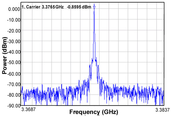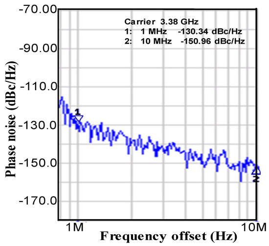 Figure 7 shows the proposed CMOS VCO measurement setup, and Figure 8 shows the proposed CMOS VCO chip micrograph. The chip’s performance was measured by a spectrum analyzer and a signal source analyzer under on-wafer probing. The chip size, including testing pads, is 0.955 × 0.655 mm2. While using a 1.4 V supply, the proposed CMOS VCO core dissipates a DC power of 7.5 mW. Figure 9 shows the measured operating frequency at 3.38 GHz with an output power of −0.86 dBm under the controlled voltages VC1 of 1.4 V and VC2 of 0 V without calibrating the 2.2 dB cable loss. The measured tuning range is from 2.85 to 3.38 GHz, as sweeping the controlled voltage VC1 from 0 to 1.4 V at the controlled voltage VC2 of 0 V. The measured tuning range is from 2.99 to 3.62 GHz, as sweeping the controlled voltage VC1 from 0 to 1.4 V at the controlled voltage VC2 of 1.4 V. The measured turning range results are shown in Figure 10. The measured CMOS VCO overall output frequency is from 2.85 to 3.62 GHz, including a tuning range of 23.8%. From the 3.38 GHz carrier frequency, the measured CMOS VCO phase noise at 1 MHz and 10 MHz offsets is −130.34 dBc/Hz and −150.96 dBc/Hz, as shown in Figure 11, respectively. The figure of merit (FOM) and the FOM with tuning range (FOMT) are often adopted to make a fair comparison for evaluating the VCO performance. The FOM and FOMT [17,18] are expressed as