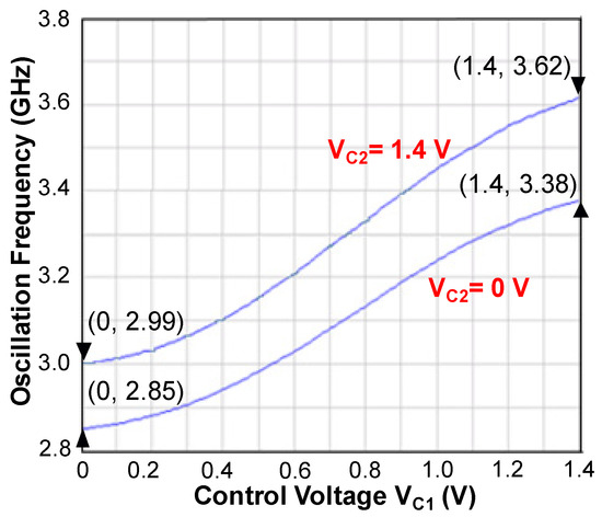 where CV is the equivalent capacitances of the varactors controlled by the control voltage VC1 and VC2 and CP is the parasitic capacitance. Figure 3a displays the simulated output tuning range between 2.86 and 3.37 GHz by varying the control voltage VC1 through 0 to 1.4 V at the control voltages VC2 of 0 V. Moreover, Figure 3b displays the simulated output tuning range between 2.99 and 3.59 GHz by varying the control voltage VC1 through 0 to 1.4 V at the control voltages VC2 of 1.4 V. The totally simulated output tuning range is from 2.86 to 3.59 GHz by the analog coarse and fine tuning mechanisms to widen the output oscillation frequency range. From the simulated results, the mechanism is very useful to improve the proposed VCO tuning range. Furthermore, silicon substrates in the CMOS process have the loss features to degrade the LC tank quality factor. Although the analog coarse and fine-tuning varactors CV1 and CV2 and CV3, CV4, CV5, and CV6, respectively, could impact the LC tank quality factor, the situation can be improved by using the class-AB mode from the threshold voltage adjustment. This is an effective and strong mechanism formed by the adaptive overdrive voltage VOV (=VGS − Vt) control technique to improve the start-up condition, phase noise and power dissipation of the proposed VCO including the process, voltage, and temperature variations. The adaptive overdrive voltage control technique consists of the NMOS transistor gate terminal and body terminal biases controlled by the voltages VG and VB, respectively.