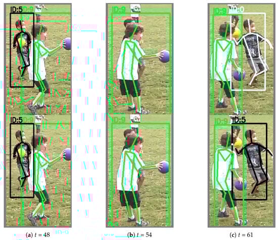 With the introduction of video datasets such as PoseTrack 2017 [] and PoseTrack 2018 [], multi-person pose tracking receives more and more attention. Two-step methods are still prone to losing the identity of individuals who disappear for several frames and reappear in the current frame, especially when heavy occlusion occurs [,,]. This is not surprising; some of these methods associate individuals only based on the pose or bounding box information of the previous and current frames, and then connect the results to the identity trajectories. Reappearing individuals are always assigned with new IDs. Some other methods attempt to compensate for this deficiency with Re-id modules, but they still heavily rely on temporal information close to the current frame. When individuals disappear for a relatively long period, these methods inevitably lead to the failure of tracking these individuals.
