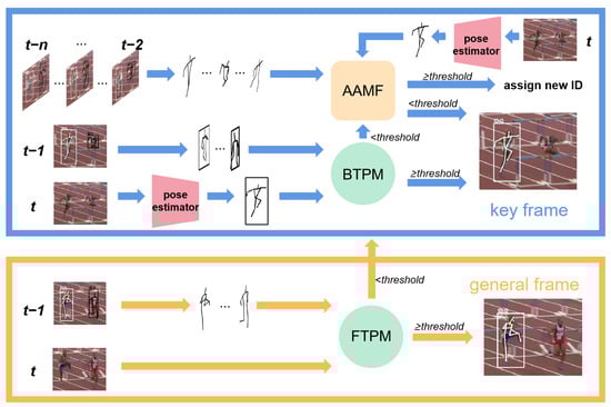 Given a video sequence, we divide the video frames into general frames and keyframes. In keyframes, we back-propagate the bounding box of the current frame to the previous frame and perform pose estimation to obtain a new pose, which is then matched with the pose results of the previous frame. We call it the BTPM module. This method avoids the problem of two poses not matching due to large movements of the same person between the previous and current frames. For some people in the video, they may reappear only after many frames due to the camera movement or person occlusion; we add an AAMF module that can trace back the tracking results of the previous frames to achieve personal Re-id. In general frames, we estimate the pose of the current frame based on the bounding box propagated from the previous frame and match it with the pose of the previous frame. We call it the FTPM module. This strategy does not consider detection clues, thereby reducing dependence on the detection results. When there is a pose that cannot be matched in the general frame, we set that frame as a keyframe and use the detection results to perform pose estimation and tracking again. We combine the two different tracking methods on general frames and keyframes, as well as the Re-id module, to achieve multi-person pose tracking. Compared with some existing methods, better mAP and MOTA results are obtained with our method. A qualitative example is shown in Figure 1. The top row is the tracking result from the baseline method; the bottom row is the tracking result from our method. And t represents the number of frames. It can be observed that our method, utilizing the Re-id module based on temporal relationships, accurately assigns IDs to human objects experiencing long-term occlusion and recurrence.