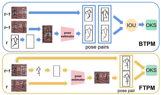 Our overall framework is shown in Figure 3. We design two distinct tracking methods for different frames. Specifically, for general frames, we want the tracking speed to be fast, so we use the forward temporal contrast of poses between adjacent frames as a tracking method, referred to as the FTPM module. In the FTPM module, we propagate the bounding box of the previous frame to the current frame and estimate the pose of the current frame. Then, we combine the new estimated pose with the pose of the previous frame to form a pose pair. The OKS result obtained from the calculation of the pose is used as the matching criteria. In contrast, for keyframes, we pay more attention to tracking accuracy, and at the same time, we need to consider some potential difficult issues between two frames, such as the large motion amplitude. In such a case, where the similarity between poses is low, simple pose comparison between the two frames may lead to tracking failure. To solve this problem, we propose a Backward Temporal Pose-Matching method, namely the BTPM module. In the BTPM module, we propagate the bounding box of the current frame to the previous frame and estimate the pose of the previous frame. Then, we combine the new estimated pose with the original poses of the previous frame to form pose pairs. Finally, in the pose-matching stage, the BTPM module relies on spatial consistency. The BTPM module utilizes the IoU and OKS results obtained from the calculation of each pair’s pose as the matching criteria. Since in most cases, the pose position changes of the same person from the current and previous frames are not very large, when the optimal Intersection over Union (IoU) of two bounding boxes and the optimal Object Keypoint Similarity (OKS) [,] between two poses from the current frame and the previous frame exceed certain thresholds, we consider them to belong to the same person. Below is a detailed description of two modules proposed for different frames.