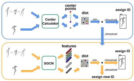 Although the BTPM module can solve the problem of mismatching two poses with a large difference in motion amplitude for the same person in the previous and current frames, it does not work when a person disappears, due to occlusion or camera movement, for a relatively long period and reappears in the current frame. As the BTPM module can only associate identities based on the temporal relationship between two adjacent frames, we add a Re-id module behind the BTPM module, called AAMF. This module not only uses the temporal relationship closer to the current frame to enhance the BTPM module but also exploits the temporal relationship further away from the current frame to compensate for the lost tracking of the BTPM module. Our AAMF module follows the overall flow as shown in Figure 4. The upper part is the center point matching module, and the lower part is the pose feature matching module. The distances between the center points of the current pose and each pose of the previous few frames are used as the criteria to assign identities. If the best-matching result is still larger than the threshold, pose feature matching will be initiated. The feature matching module first inputs the current pose and the previous few frames’ poses into the SGCN module to output the feature vectors of the poses. Then, the difference between the feature vectors is calculated, and the result with the smallest difference is selected as the matching result.