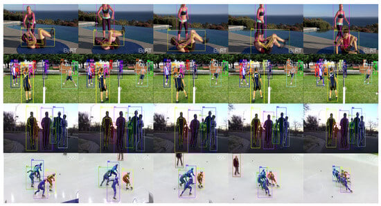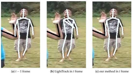 Currently, most multi-person pose-tracking methods follow a two-step approach of detection and tracking. They typically perform human detection on the current frame, extract information about the position and keypoints of each detected human object, and then match the human objects in the current frame with the human objects in previous frames based on this information, thereby achieving multi-person tracking. With the development of Convolutional Neural Networks (CNNs) [,,,] and the release of large-scale datasets such as MPII [], LSP [] and COCO [], the ability of multi-person pose estimation (MPPE) [,,,] has been improved significantly. Some previous multi-person pose-tracking methods benefit from the accuracy advantage brought by MPPE and obtain better tracking results. However, some other multi-person pose-tracking methods [,,,] do not rely on the selection of MPPE methods but try to improve the accuracy through tracking means.