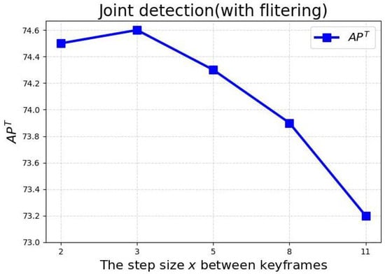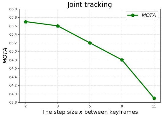 In this section, we evaluate the impact of the step size between keyframes on the results. In our experiments, we first select keyframes based on a fixed step size, and then set the other frames as general frames. We set the step size between two keyframes as a variable x and conduct experiments with different x values. The experimental results on AP and MOTA evaluation metrics are shown in Figure 7 and Figure 8. From Figure 7, we can see that the mAP with filtering has a slight improvement when the step size increases from 2 to 3. We speculate that this is because there are more general frames, and the FTPM module based on the generated bounding boxes from keypoints can perform better. As the step size continues to increase, there are more general frames, and the positional offset of the same pose between two adjacent frames will gradually increase. This will lead to a decrease in the accuracy of the generated bounding boxes from the previous frame’s pose, which ultimately leads to a decrease in AP. From the results of the keypoint tracking in Figure 8, as the step size of the frame increases, the result of MOTA gradually decreases; therefore, frequent keyframes can help improve the performance of MOTA. Finally, to better evaluate our tracking model, we prefer to achieve better tracking results and set the value of x to 2.