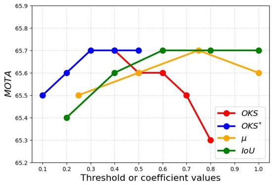 Here,  represents the threshold, w and h denote the width and height of the bounding box of a specific pose to be matched, and  represents the coefficient. Its value is related to the model’s results as indicated by the yellow curve in Figure 9. From the graph, it can be observed that as the coefficient  increases, the tracking accuracy also increases, reaching a maximum at 0.75. Similar to OKS, when the coefficient is small, there might be erroneous matching results, and when it is large, there might be missed correct matching results. Therefore, in our experiments, we set the coefficient  to 0.75.