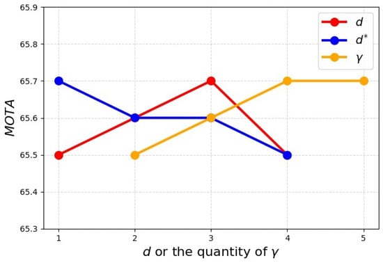 where  = [0, 1, 2, 3], and the values of d are illustrated in Figure 10. The red line represents the relationship between the tracking results and the values of d in the center point module, while the blue line represents the pose feature module. Figure 10 indicates that in the center point module, as the value of d increases, the MOTA value also increases, benefiting from the inclusion of long-term temporal information for tracking. However, as d continues to increase, the MOTA value decreases. This is because, at larger distances, poses may not provide reliable temporal information. On the contrary, it might lead to some erroneous matches. Therefore, we set d to 3, with the corresponding n being 11. As shown in the blue line chart, in the pose feature module, as the number of frames increases, the magnitude of the pose variations also increases, leading to a decrease in the performance of pose feature matching. Consequently, the MOTA value decreases with the increase in d. Therefore, we set d to 1, with the corresponding n being 5. As shown by the yellow curve, we conducted a comparative experiment on the number of , and the results indicate that as  increases, MOTA gradually increases and reaches its maximum when  is greater than or equal to 4, remaining constant thereafter. This is because when  is too small, the center point module cannot provide sufficient long-term information. Therefore, in our experiments, we set the quantity of  to 4.