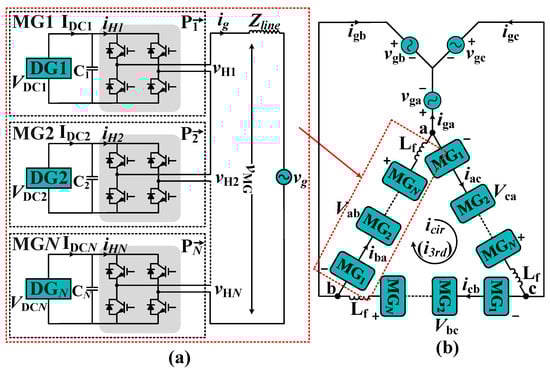 Initially designed for multilevel converters [], cascaded converters have been subsequently extended for MG applications [,,,], named as SCMG []. In Figure 1a, each DG unit forms an MG system (MGN) with increased voltage levels through a series converter. Notably, the cascaded type has proven to be particularly practical in applications such as PV grid-connected systems [] and battery management [,]. The SCMGs control methods can be applied to multilevel converter topologies, providing voltage and frequency support to the grid.