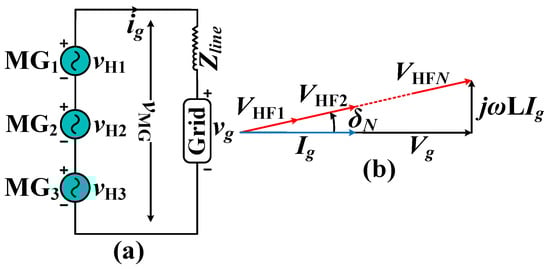 where ω is the grids’ angular frequency; VHFi is the phasor form of vHFi (fundamental component); ki represents the control signal of each module; and Vg and Ig are the phasor forms of vg and ig, respectively. The SCMGs’ equivalent AC circuit is shown in Figure 2a and the phasor diagram in Figure 2b, where the voltage component of inductance L is significantly smaller compared to the grid voltage, allowing for δ to approximate zero.
