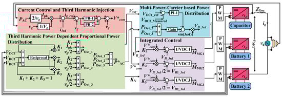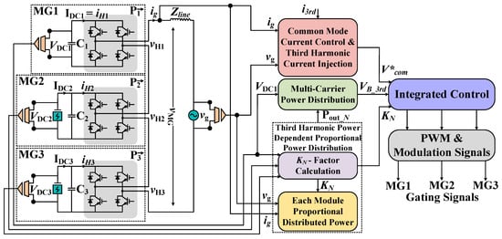 The integrated control methodology consists of multiple components, including a current control loop based on third harmonic current injection and a multi-power carriers-based power distribution loop between DG sources- modules. Notably, the fundamental principle extends seamlessly to a higher number of DG sources-based SC modules, continually enhancing the power-sharing capabilities among the cascaded units. The role of a current control loop is to ensure the regulation of grid current. The power distribution control enhances the power-sharing range while reducing the number of voltage control loops by implementing a third harmonic power-dependent proportional power-sharing mechanism between SC-DG sources-based modules. The control structure of the SCMG is presented in Figure 4 and the block diagram of DG-units-based SCMG is shown in Figure 5.