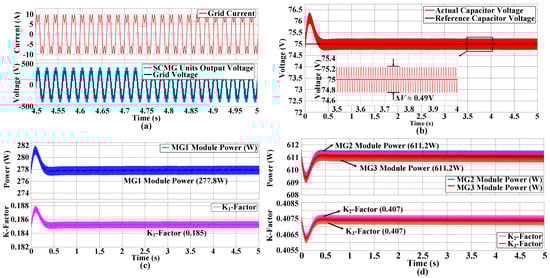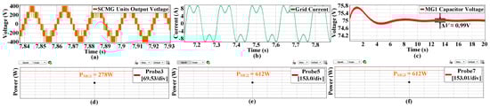 Figure 7a indicates that the output step-voltages remained stable over time during MG1’s capacitor voltage balancing, with stable grid current and in-phase with the grid voltage. The injected third harmonic current is present in the grid current (Figure 7a) as it should appear in the single phase according to the control methodology (Figure 5). The significance of the third harmonic current injection in fundamental frequency current can be seen in Figure 7b, where it balanced MG1 capacitor voltages at the reference value of 75 V. Finally, from Figure 7c,d, the third harmonic power-dependent proportional power distribution is validated, where each module delivers active power to the AC-side in proportion to the DC-side voltage of each module’s kN-factor. It is clearly seen from Figure 7c,d that the 611.2 W active power is delivered by each module MG2 and MG3, and the remaining required power of 277.8 W by SCMG is delivered by third harmonic power sharing, which clearly indicates that the proposed control in Figure 5 is working at its potential.