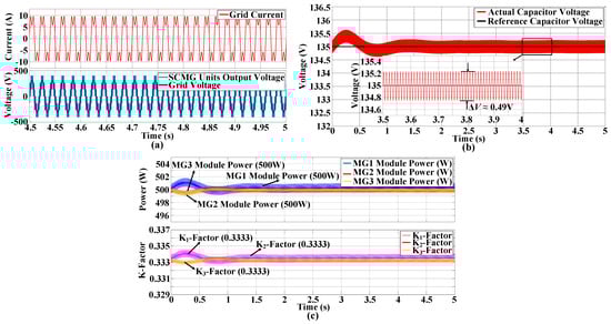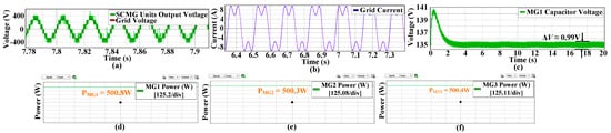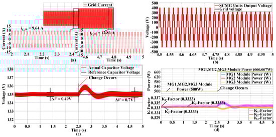 Figure 9a represents the grid current (fundamental plus third harmonic current), which stabilized in a short time after a sudden increase in grid-side power demand at t = 2.5 s. It signifies that the developed integrated control (Figure 5) has the capability to work under various conditions. Figure 9b illustrates that the SCMG modules’ output voltages were synchronized with the grid voltage while maintaining the seven-level step-voltages even during the change in power reference condition. Furthermore, the control maintains the stability of MG1’s capacitor voltage in accordance with its reference voltage at 135 V again at 4.2 s, even after an abrupt change in grid-side power demand, see Figure 9c. Finally, Figure 9d confirms that each SCMG module delivers power proportional to its kN-factor before and after the event of power variation. Before 2.5 s, MG2 delivered 500 W active power and MG3 delivered 500 W active power, and the remaining power demand of 500 W by SCMG was remunerated by third harmonic current injection; however, after 2.5 s, this remaining power demand increased to 666.67 W, which was still being compensated by our proposed control, as shown in Figure 5.