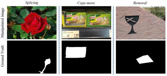 Some examples of manipulated images. From left to right, we show three common manipulation operations (i.e., splicing, copy-move, and removal) with the corresponding ground truth mask.
