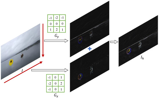 Let be the input image of the High-Frequency Auxiliary Branch (HFAB). We first apply the Sobel filter to filter out the low-frequency component of the image, which is achieved by separately detecting the horizontal and vertical boundaries along an image, as shown in Figure 4. The Sobel filter uses a pair of 3 × 3 convolution kernels in both the horizontal and vertical directions by measuring the two-dimensional spatial gradient on an image. The kernel calculates the spatial gradient in the horizontal direction while the kernel calculates the spatial gradient in the vertical direction. Finally, the information of two directions is added together to generate , which can be formulated as