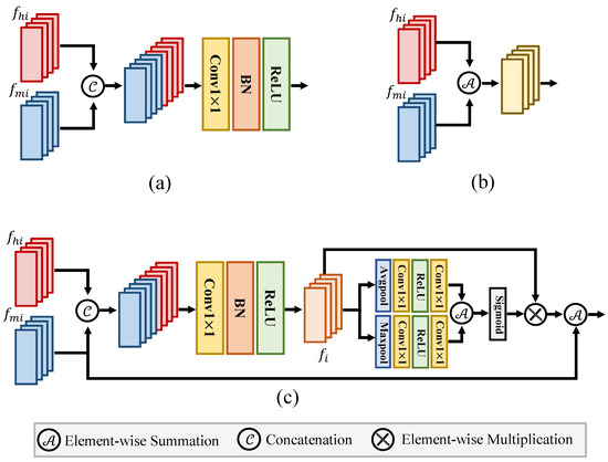 As illustrated in Figure 5c, for an input high-frequency information and the hierarchical feature are learned from the main stream branch. Given the corresponding features of the two feature sets and , , the two features are first concatenated along the channel dimension. Then, the concatenated feature is sent to a convolutional layer with kernel, a batch normalization layer, and a ReLU activation function. The above operation can be formulated as