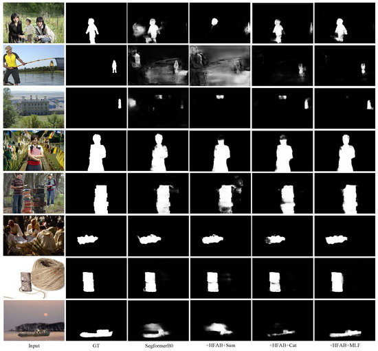 Qualitative results of the HFAB & MLF. First, we show the different variants of our network (following the setting in Table 4). As shown in Figure 6, with the help of the HFAB branch with different fusion methods, the model achieves better qualitative results than SegformerB0. Furthermore, when applying the MLF module, compared to the element-wise summation (sum) and concatenation (cat) feature fusion method, the proposed MLF generates a more accurate prediction. These results further demonstrate that the proposed method is beneficial for the model to locate the manipulated regions.
